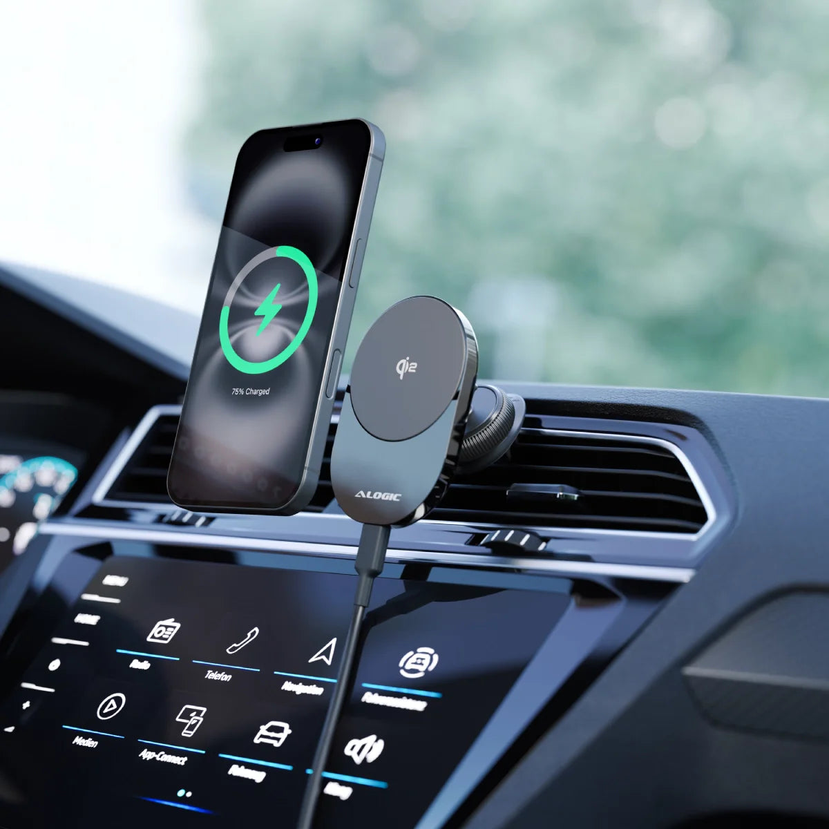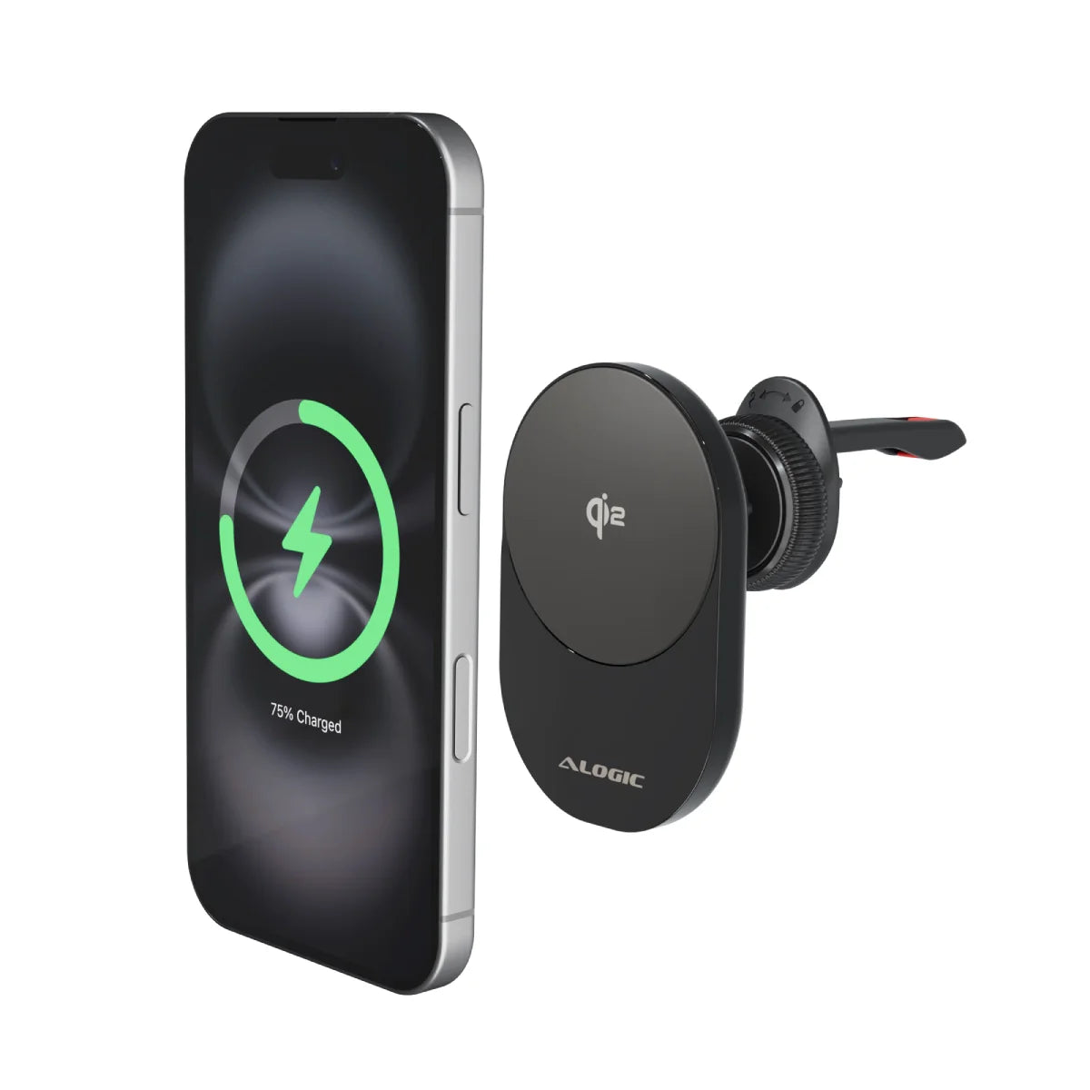 Clip combines blazing fast wireless charging for MagSafe, Qi and Qi2 phones, with a rock-solid magnetic phone mount that attaches to your car’s air vents.